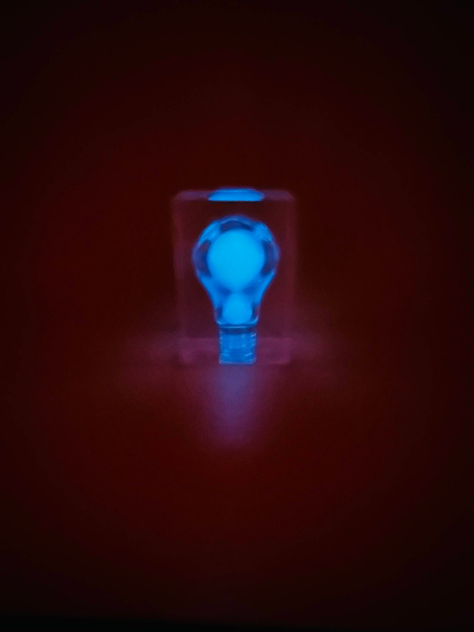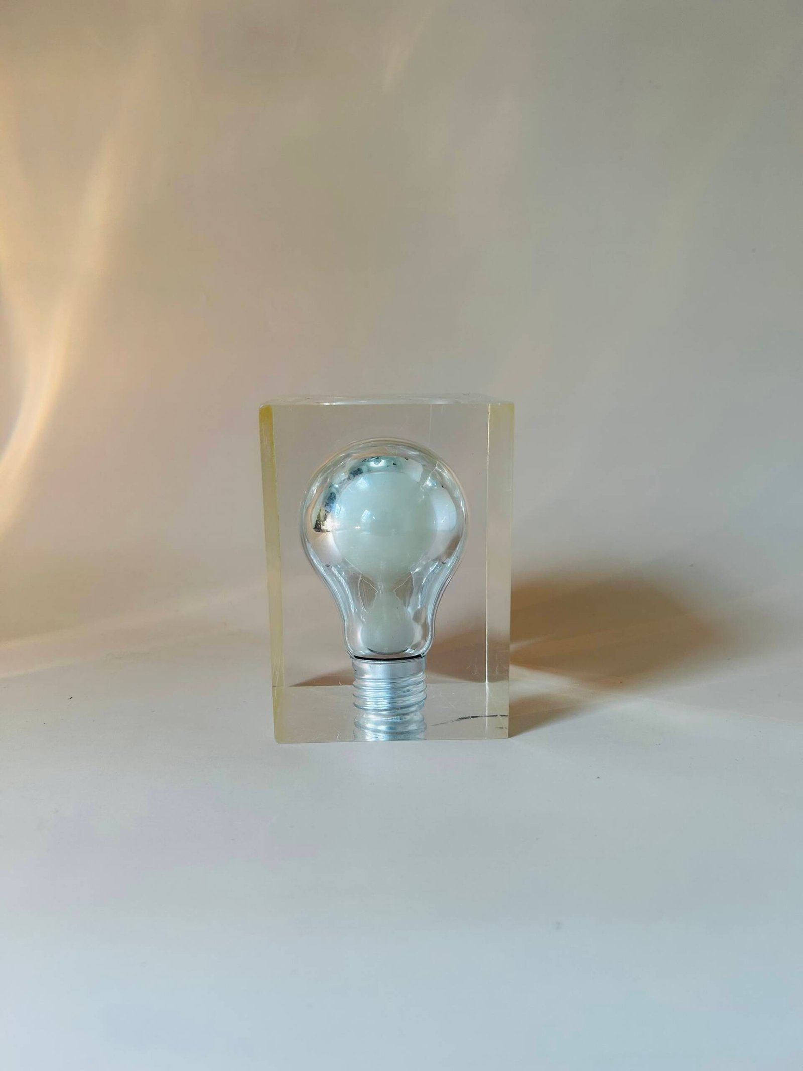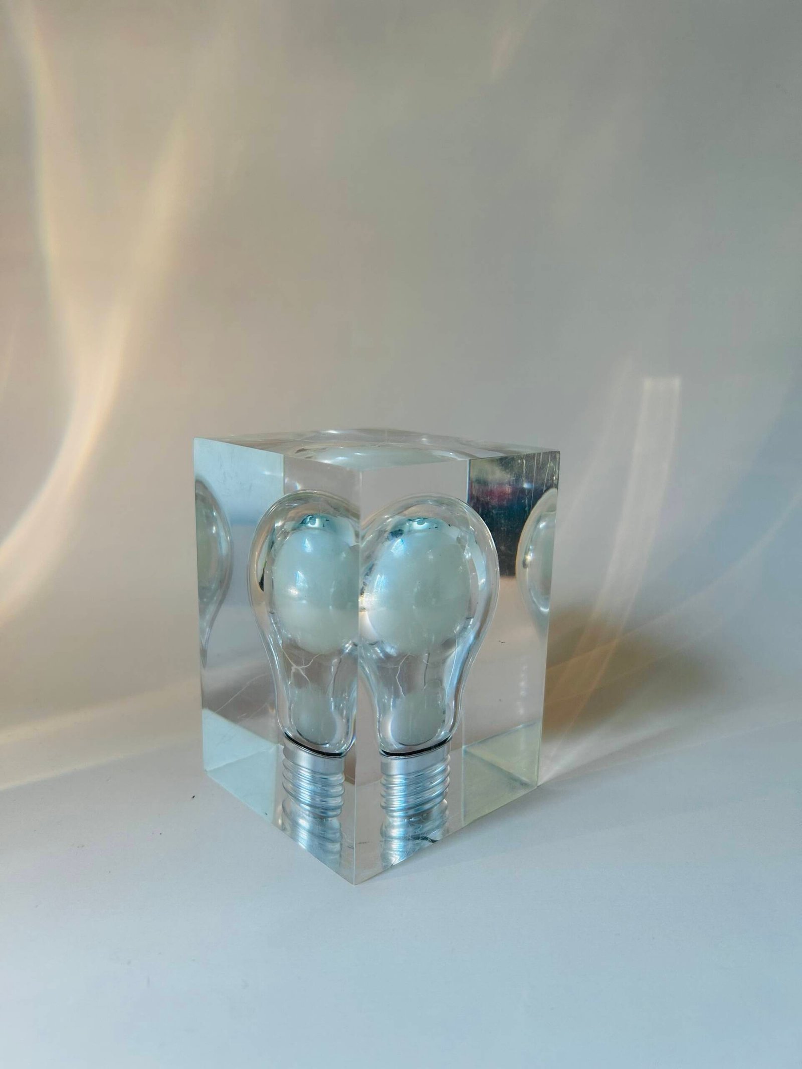 A funky pop art-inspired desk accessory that glows in the dark, encased in lucite acrylic.