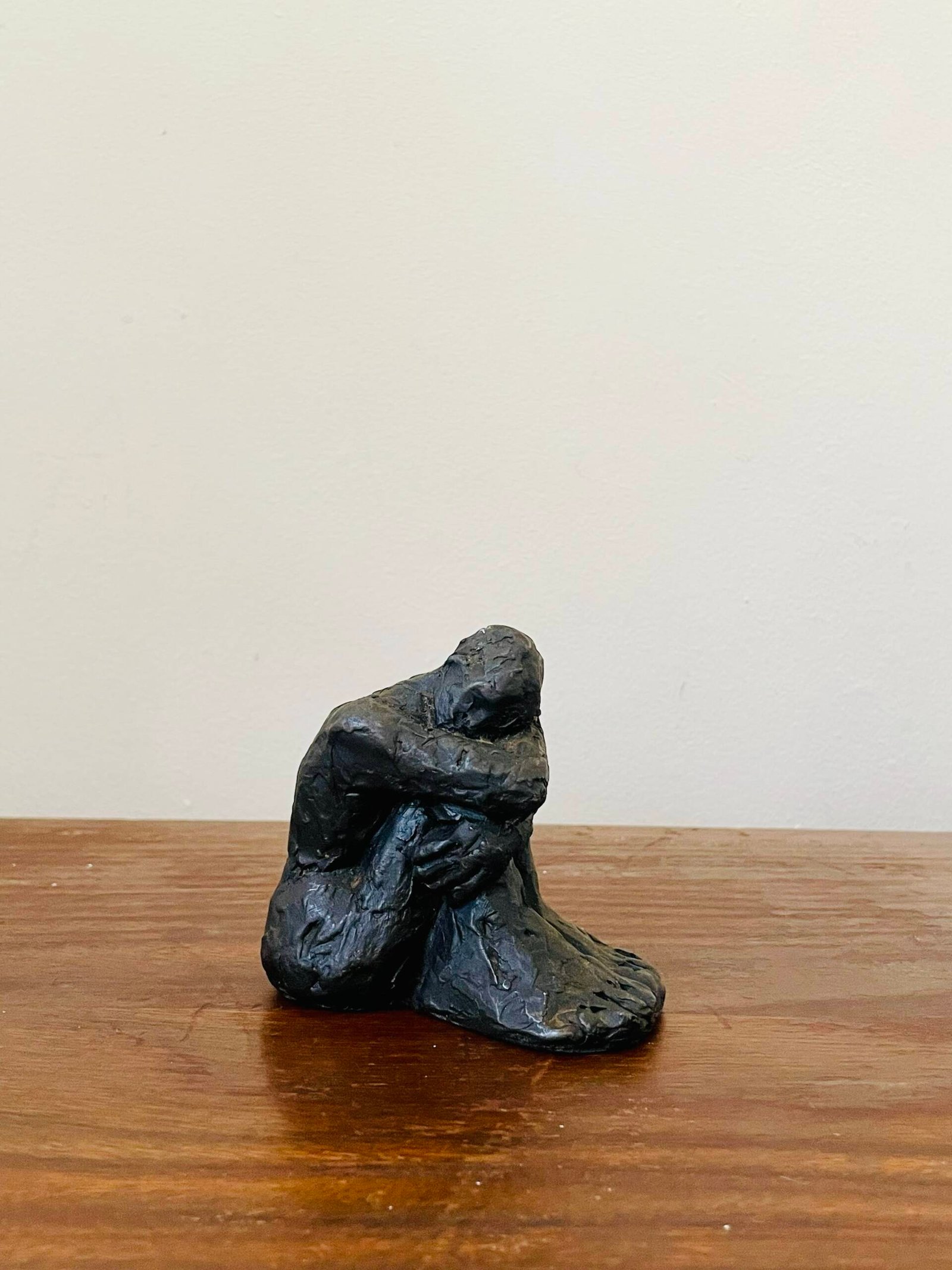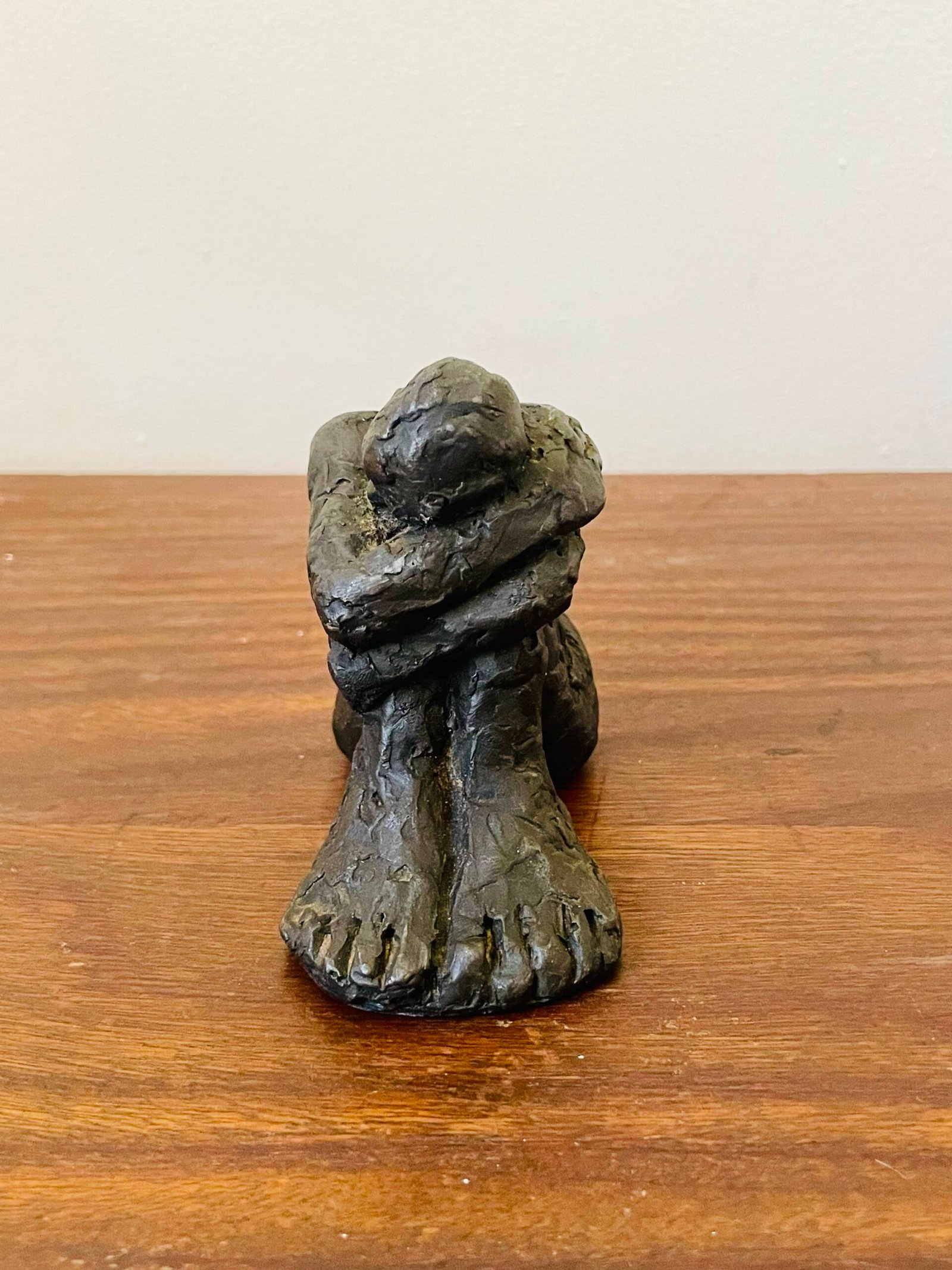 A beautiful sculpture made from resin which depicts a man comforting himself.