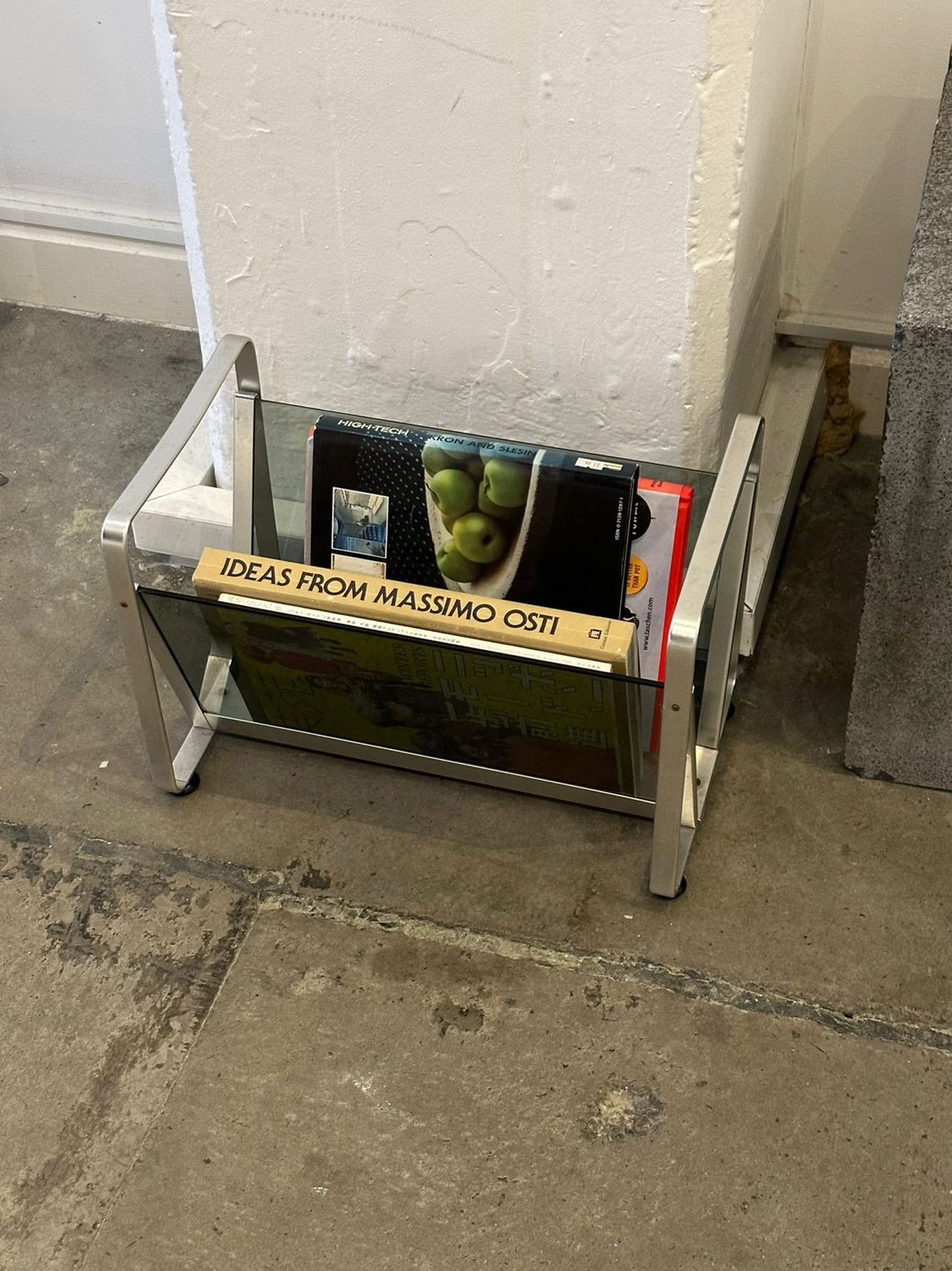 Produced between 1960-1969, this beautiful magazine rack is made with an aluminum frame with two glass side plates. Condition is Good, but has a slight bend (pictured ) it’s pretty heavy , so handle with care.
