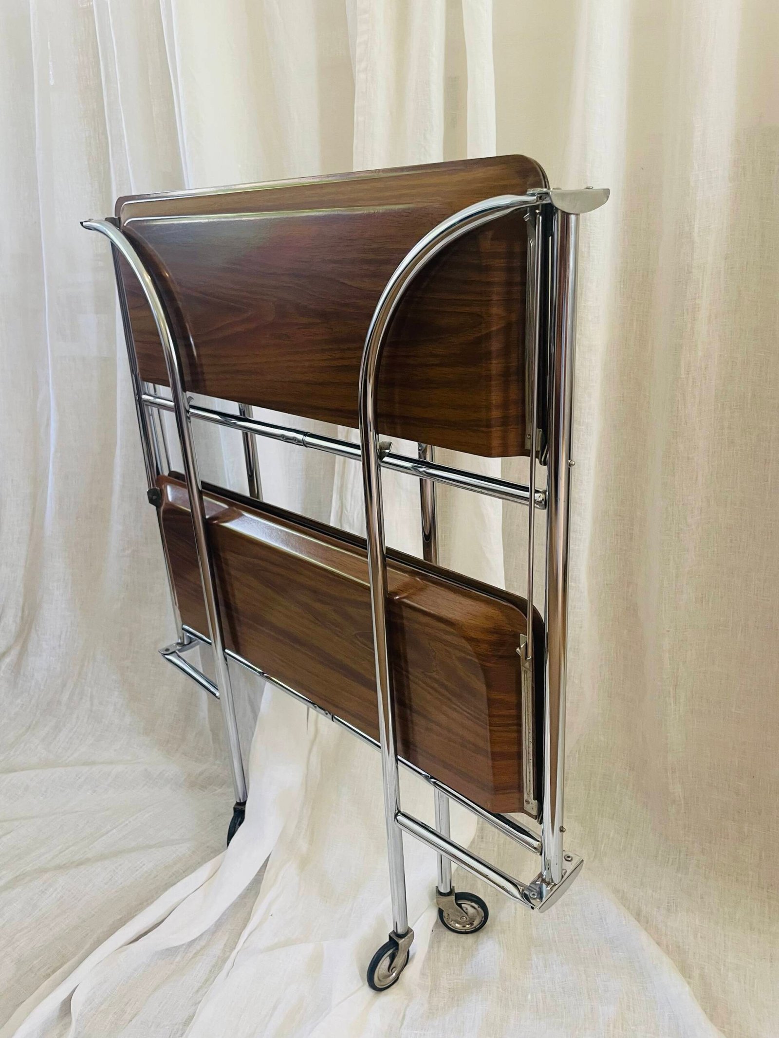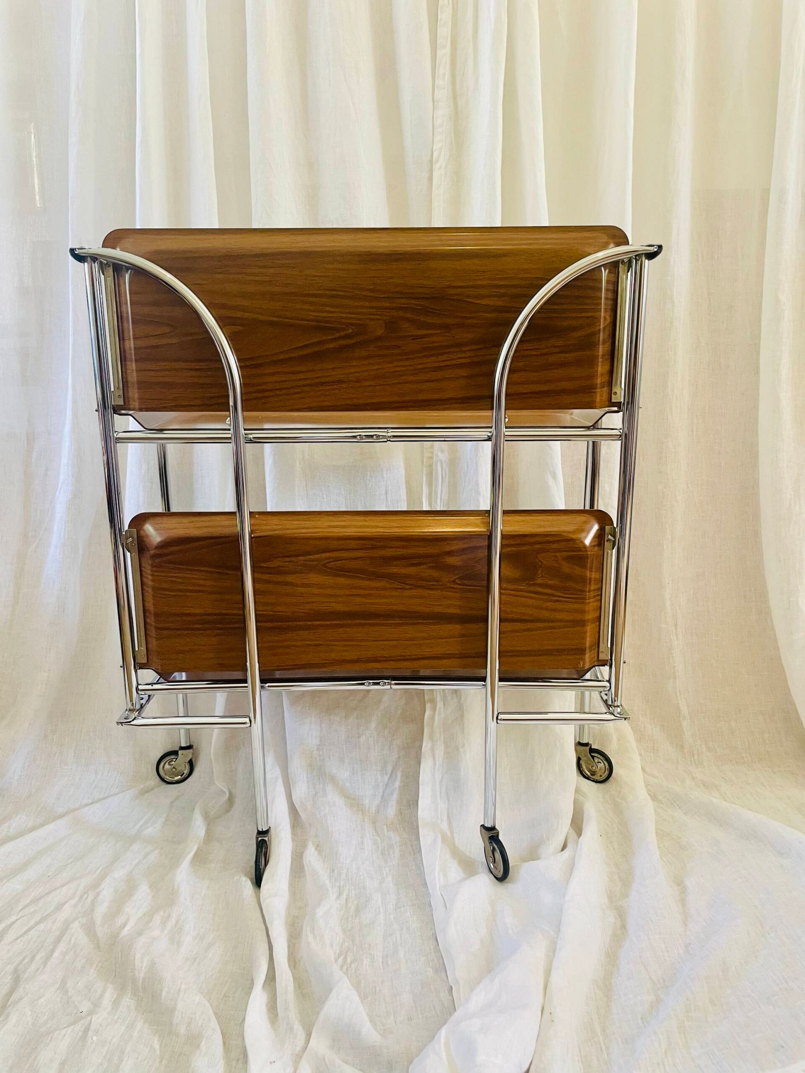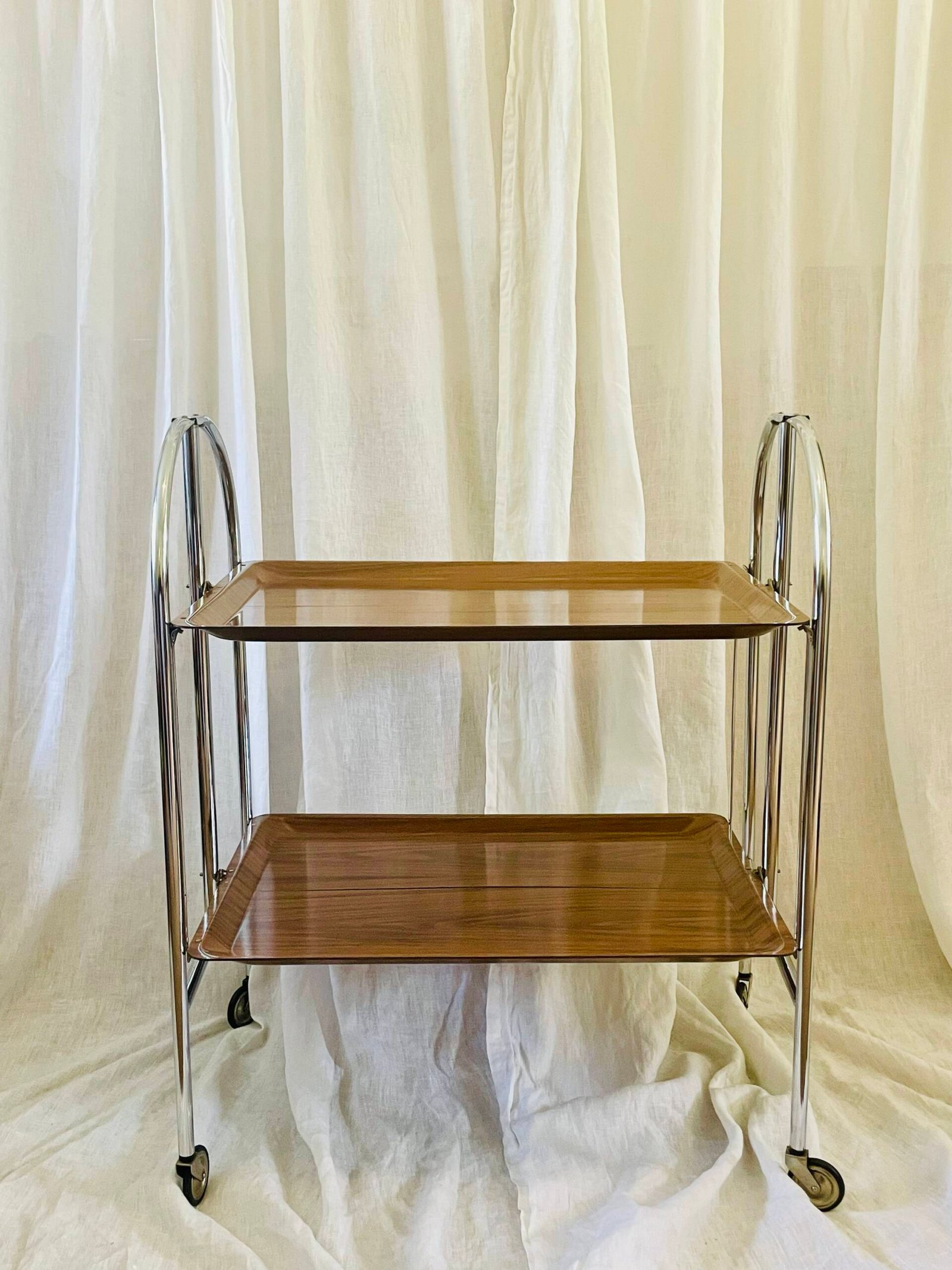 Mid-Century Modern Chrome & Wood Veneer Two-tier Serving Cart, Made In Germany ๐Ÿ‡ฉ๐Ÿ‡ช