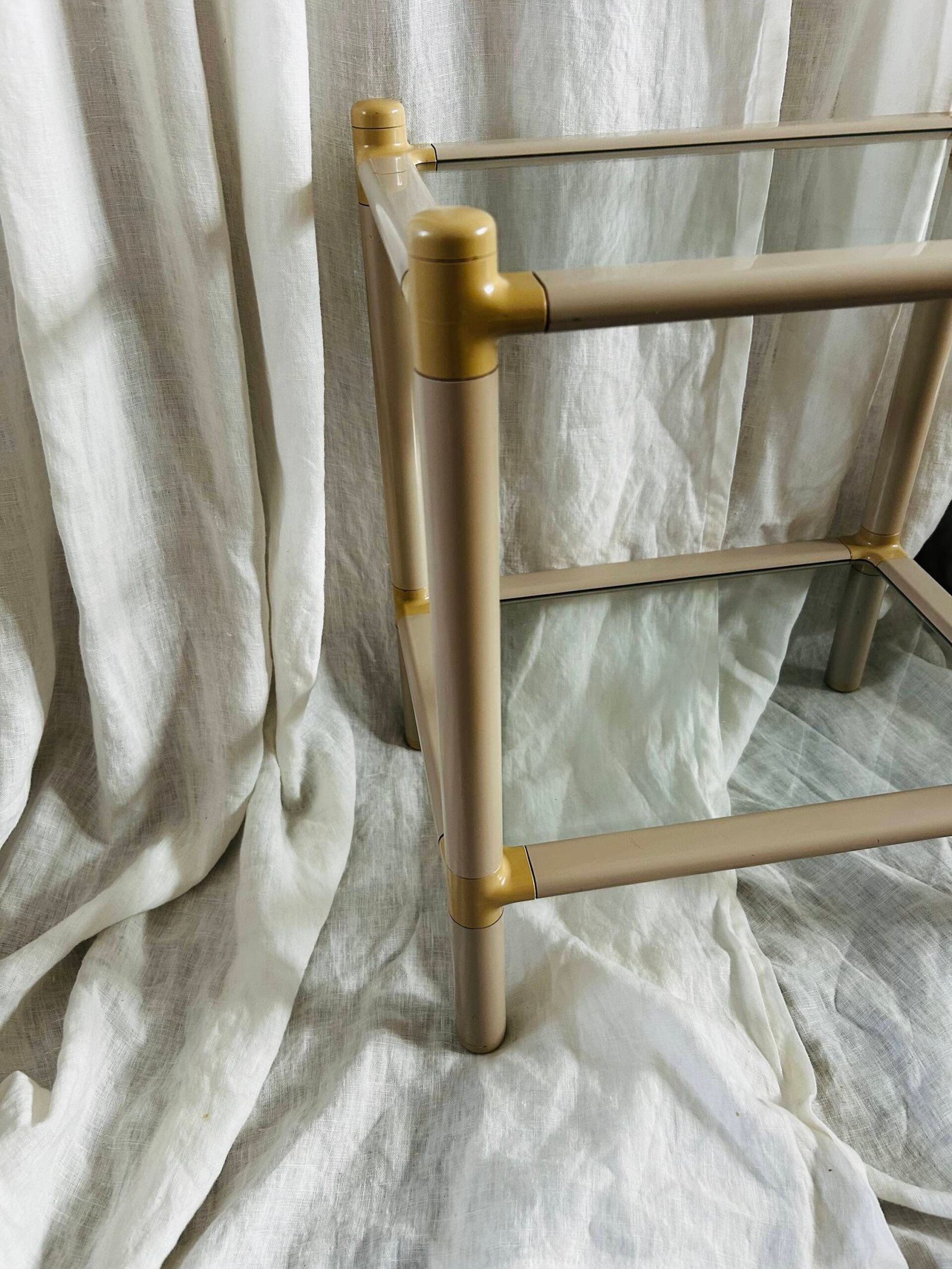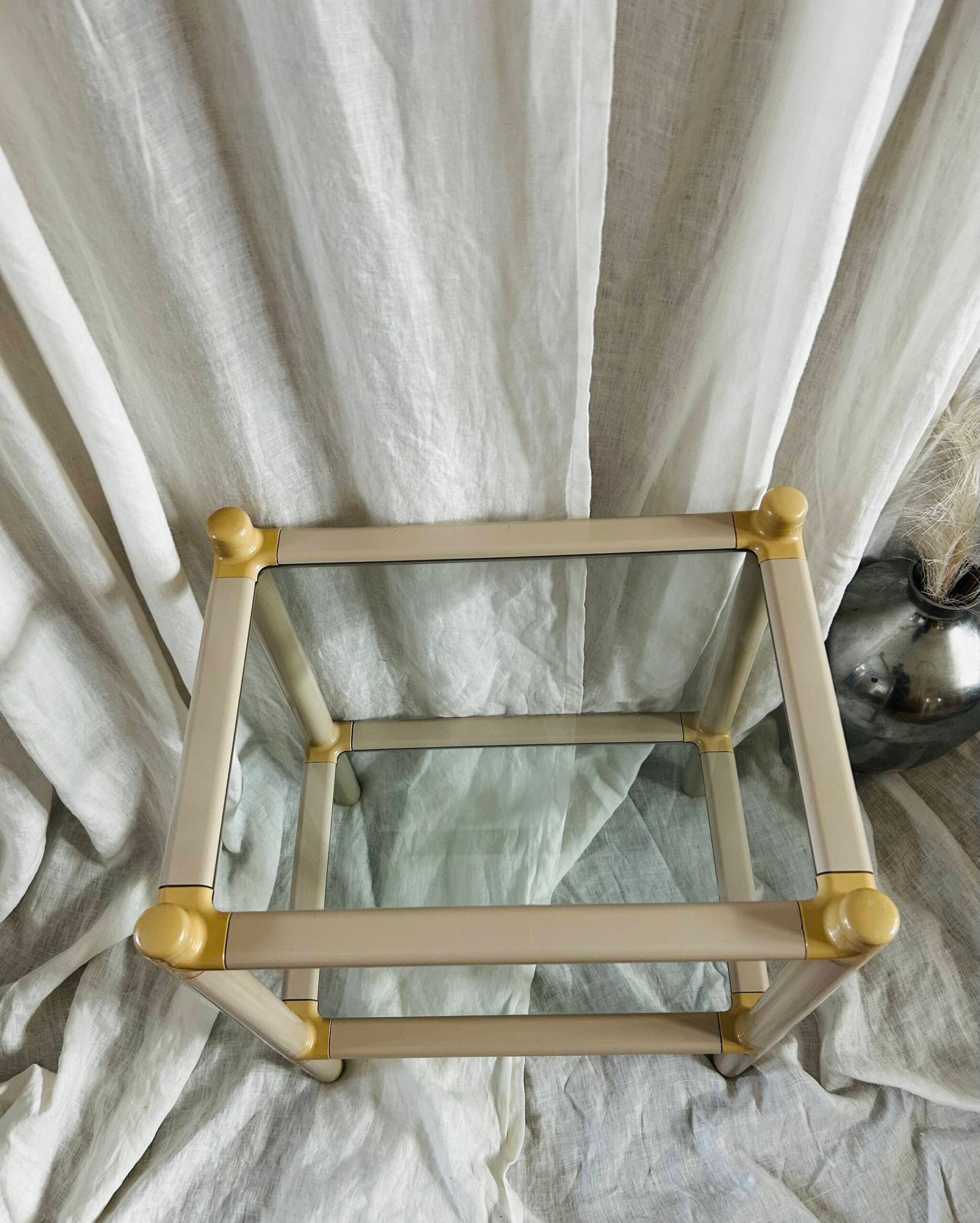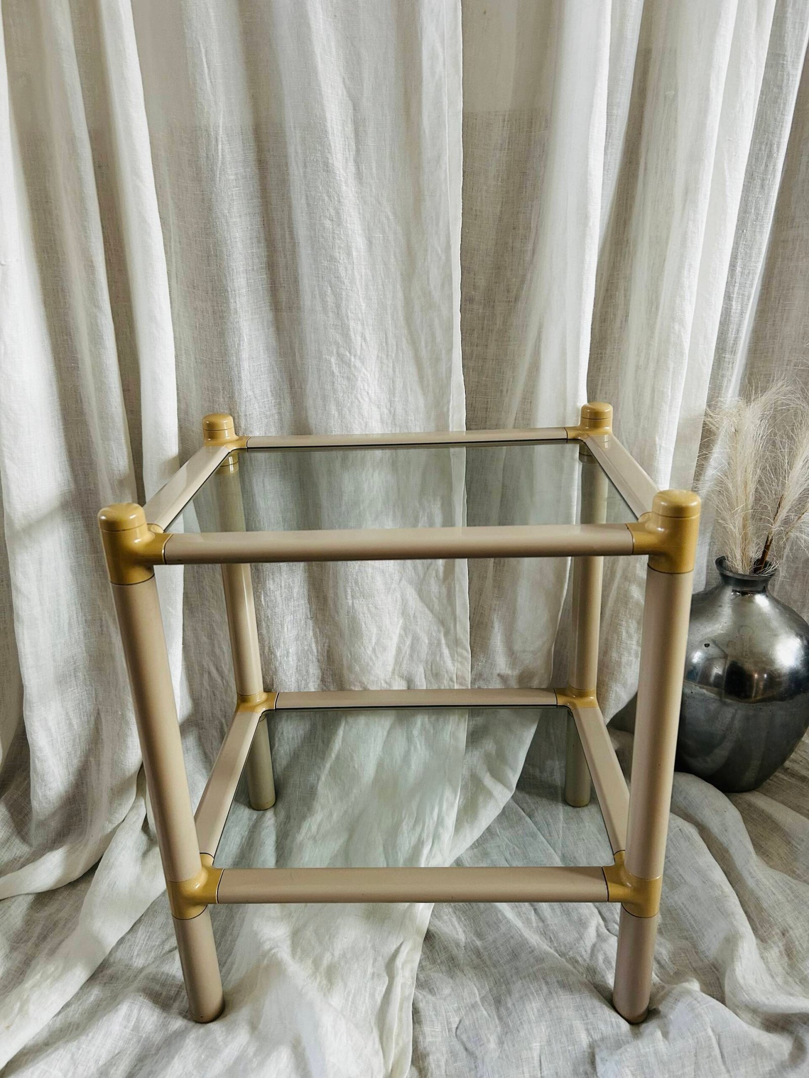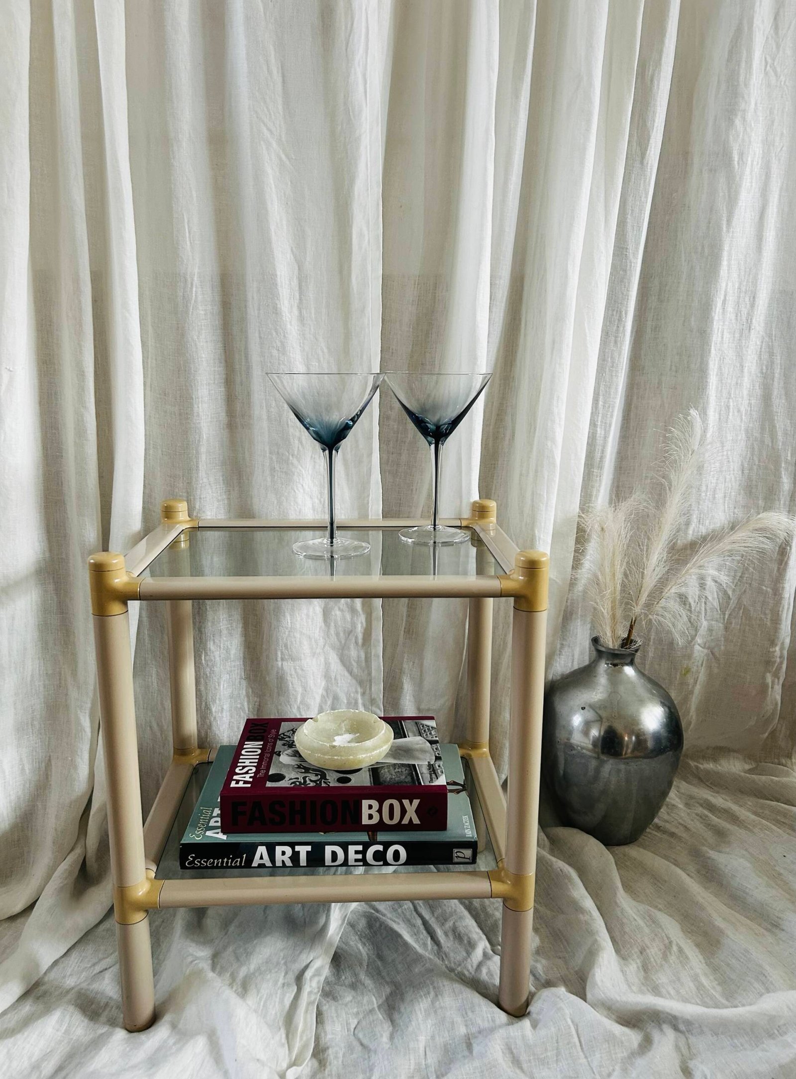 This type of two-tier side table, often referred to as a “galleria” or “drinks” table, became popular in the 1970s and 1980s. They were designed to be both practical for holding drinks and decorative objects, fitting seamlessly into contemporary living spaces.
