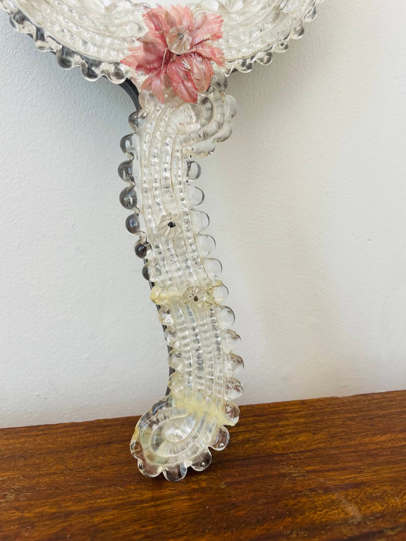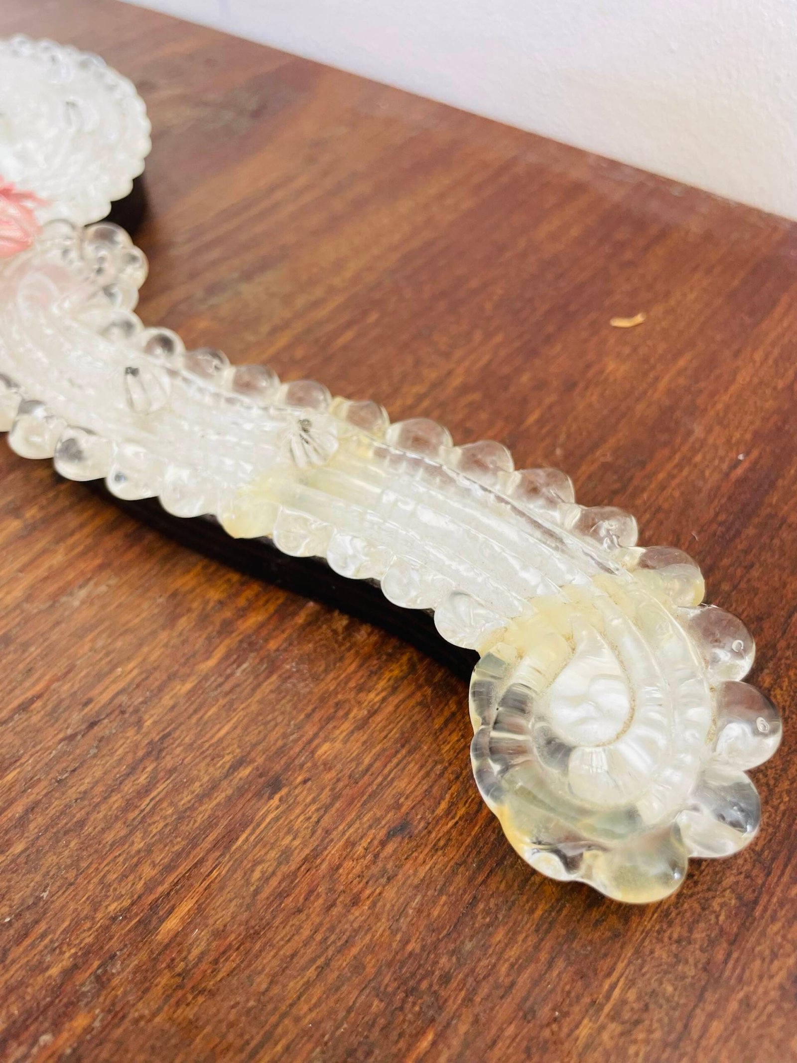 Hand-blown glass, beaded swirls and delicate pink flowers.