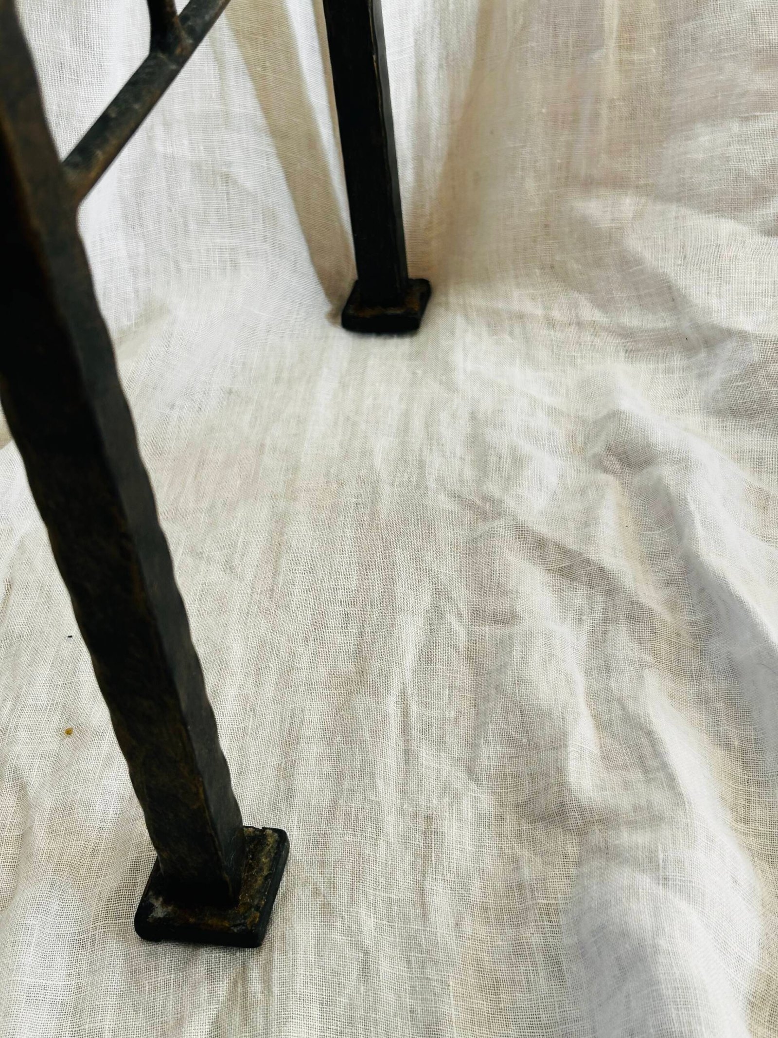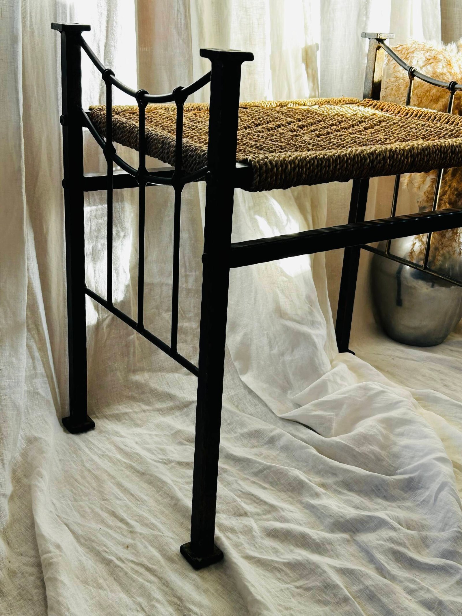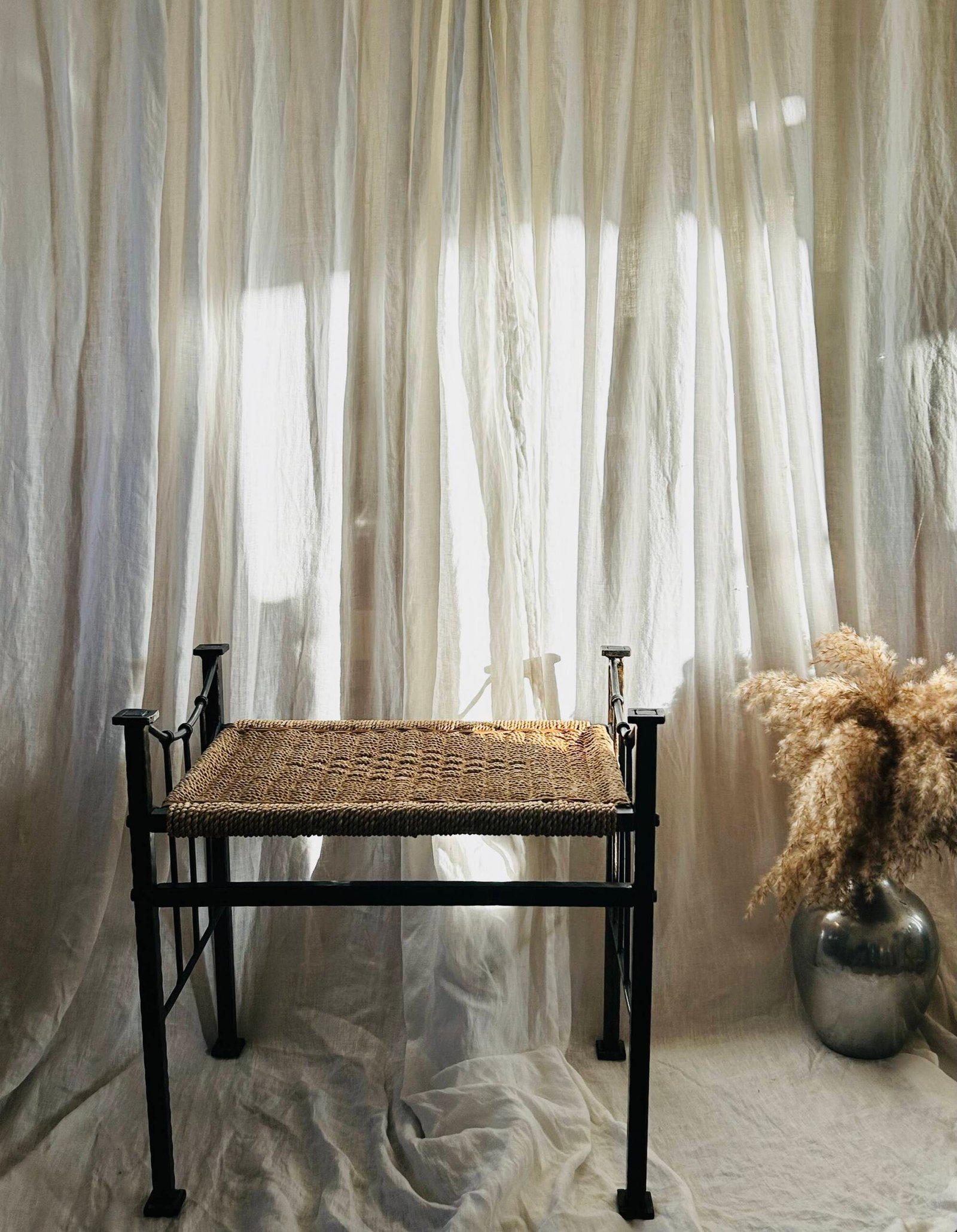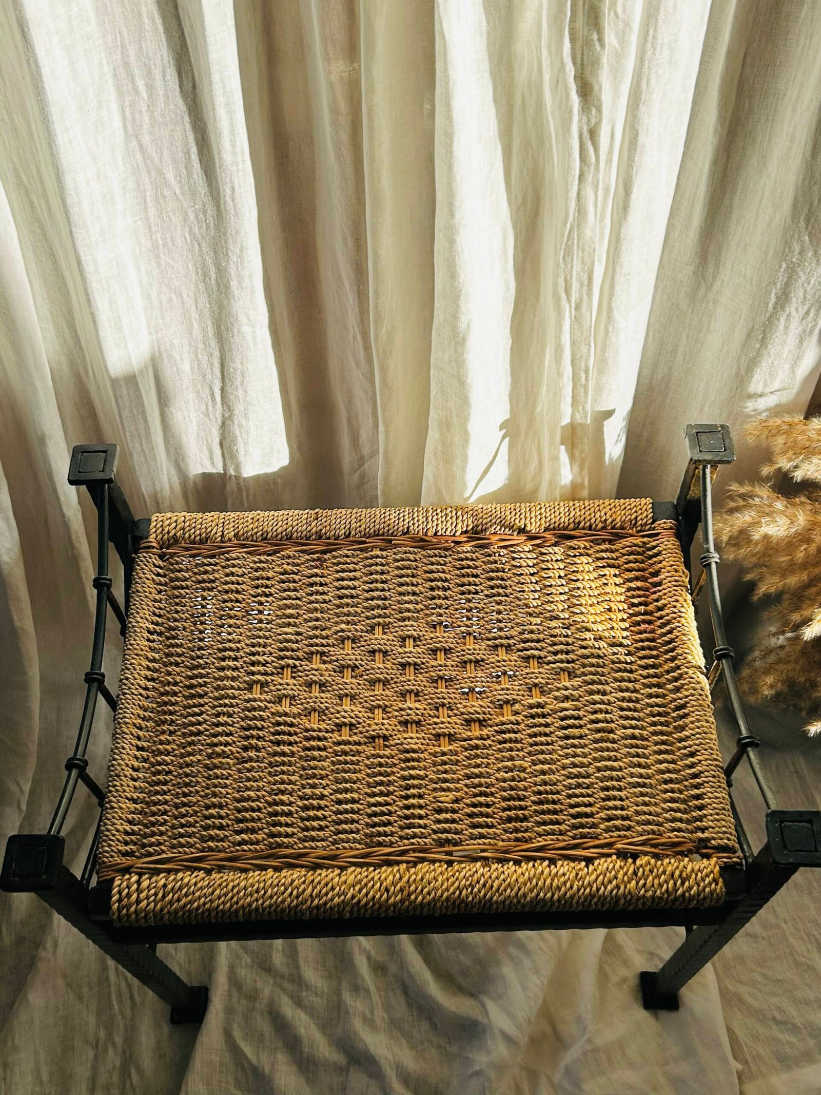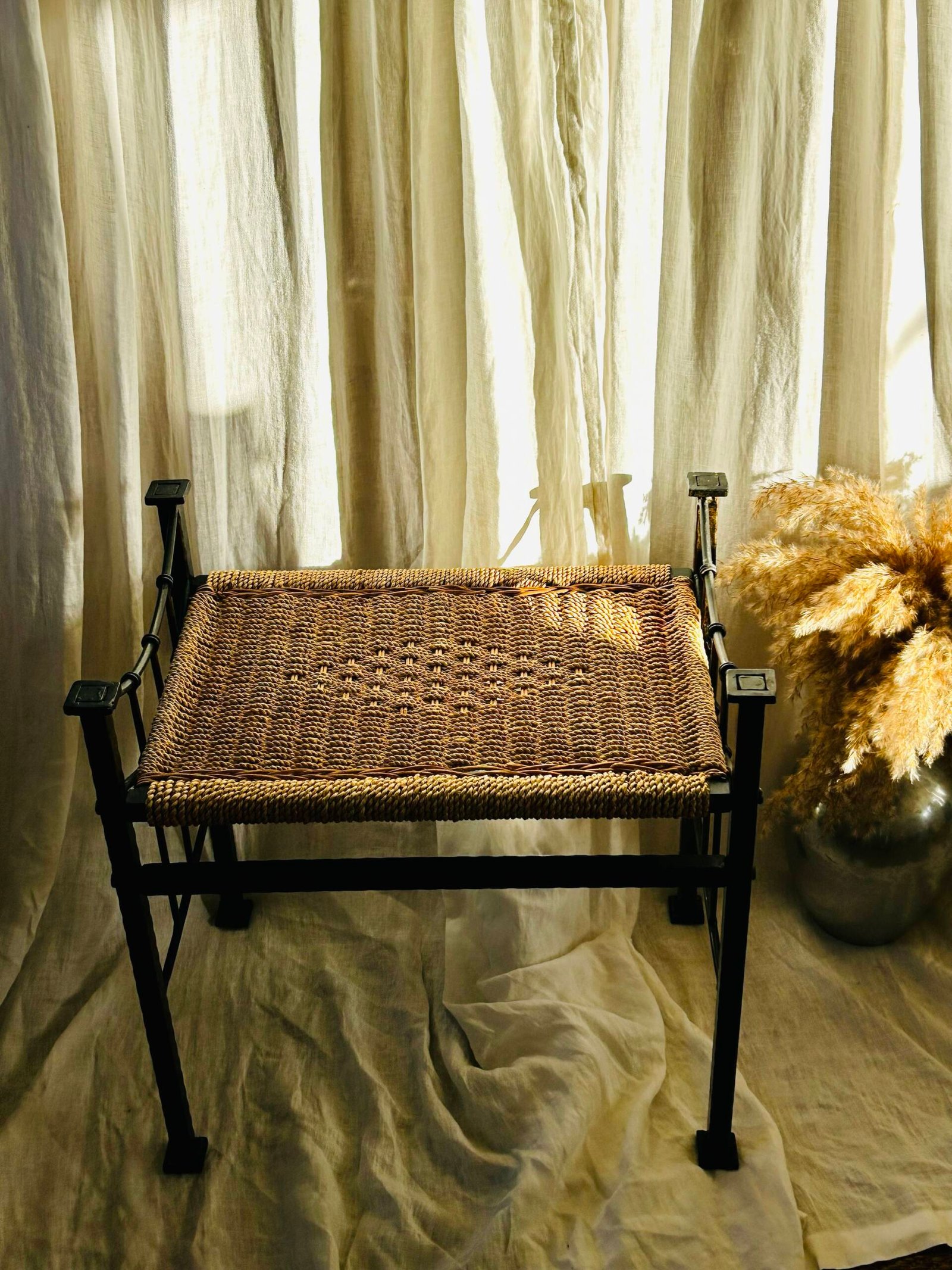 A lovely stool, with its dark metal frame and tightly woven natural fiber seat, aligns with the functional and decorative trends of that time.